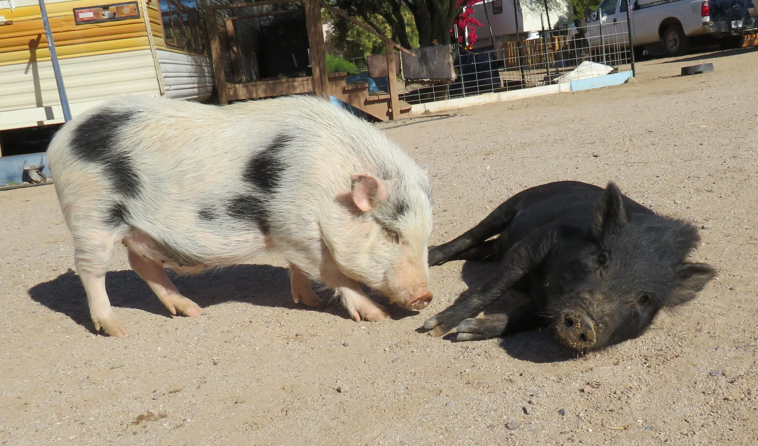 We met at the sanctuary then got adopted together. Later our moms moved to a new place that wasn’t zoned for pigs and got in trouble. We are both around 8 years old and are best friends.