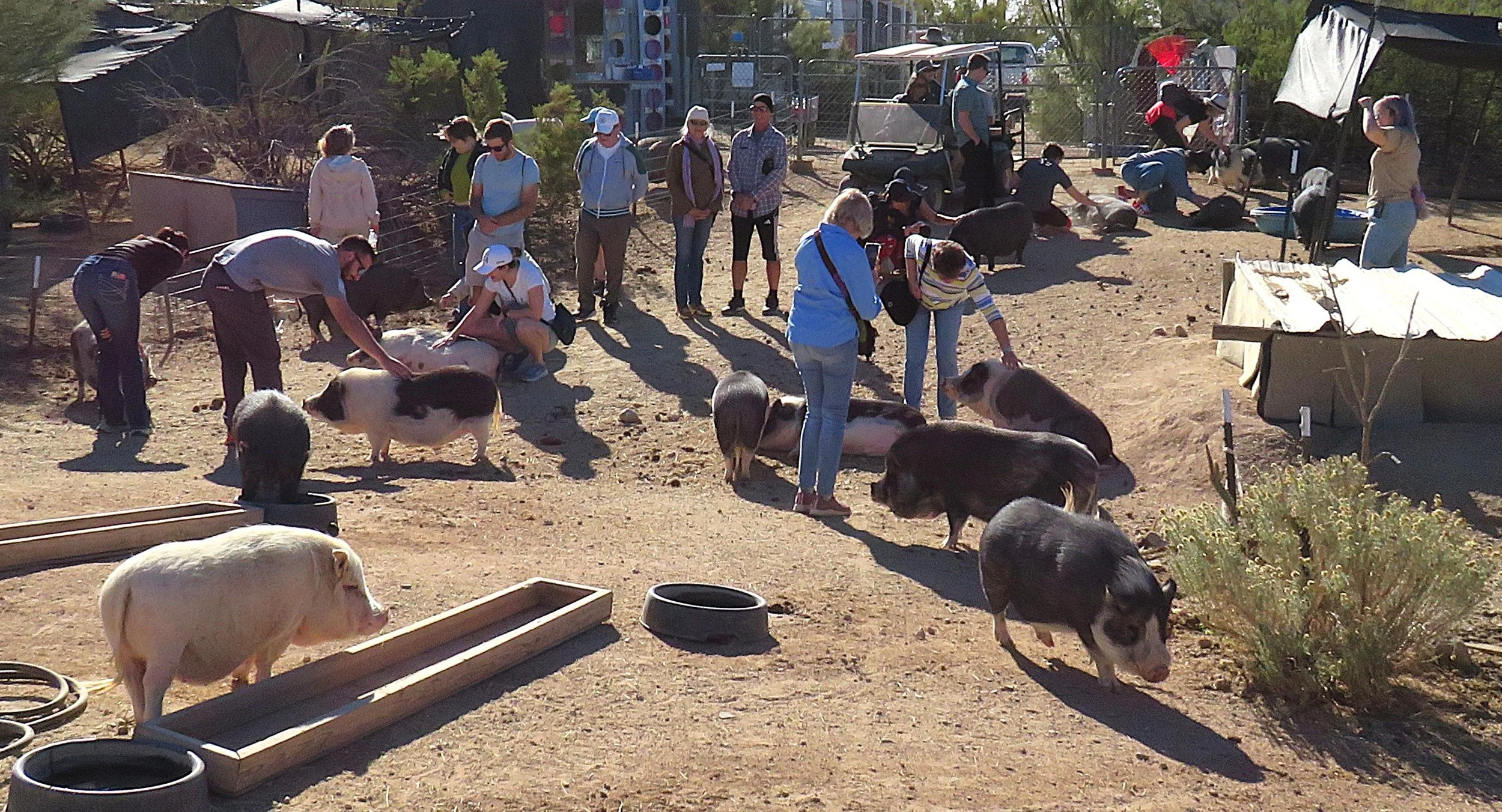 The sanctuary is located on the left of the dirt road Crystal Visions Rd., 0.7 miles from Cattle Tank Rd. Look for our “Pig Country” fence and our sign.